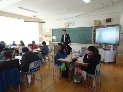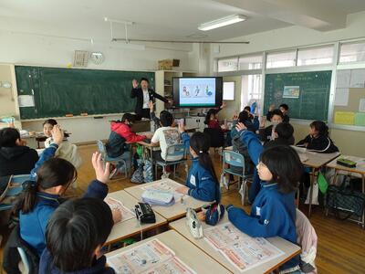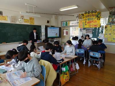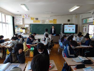 1月30日(金)に、明治安田川越支社東松山営業所長の荒田竜助様、飯村奈緒子様など、志賀小学校に来校してもらい出前授業をしました。